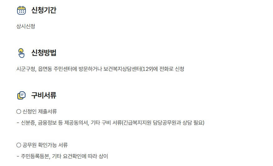 - 신분증, 금융정보 등 제공동의서, 기타 구비 서류(긴급복지지원 담당공무원과 상담 필요)
