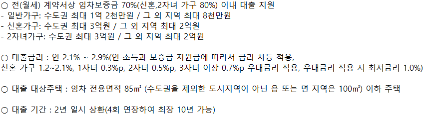 전(월세) 계약서상 임차보증금 70%(신혼, 2자녀 가구 80%) 이내 대출 지원