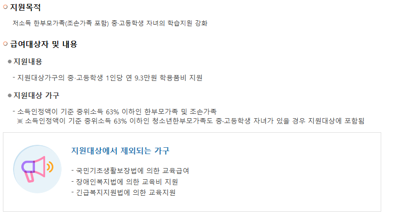지원대상가구의 중‧고등학생 1인당 연 9.3만 원 학용품비 지원