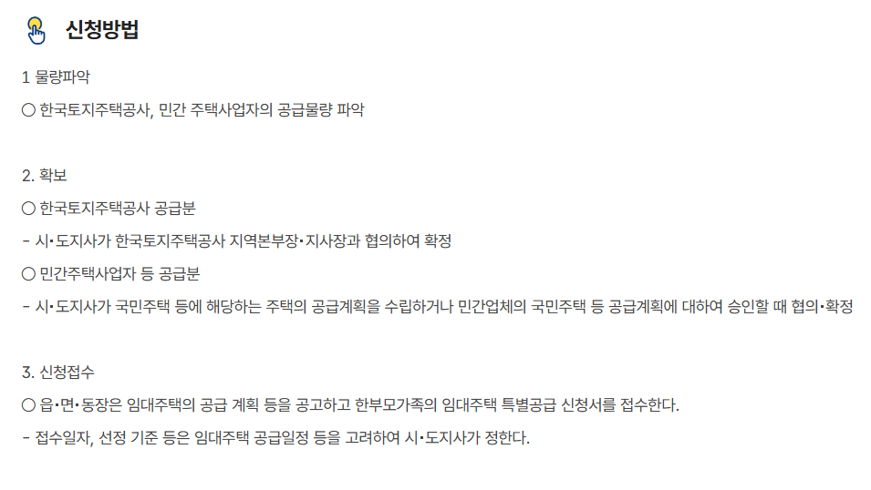 - 한국토지주택공사: 각 지역본부와 협의하여 공급 물량 파악